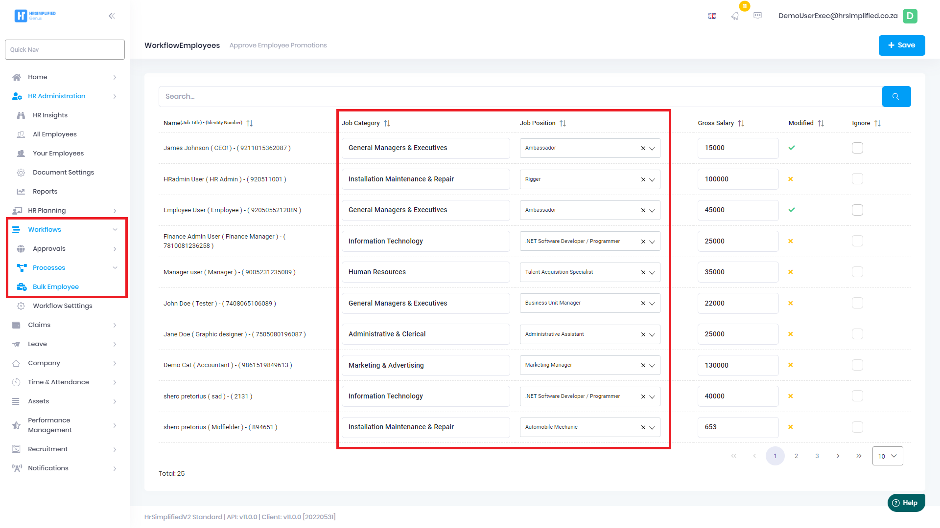 HRSimplified contains a simple interface to allow the HR Administrators to make quick and easy bulk Employee profile updates. This can be found under the Workflow section in HRSimplified. This is called a Promotion workflow.