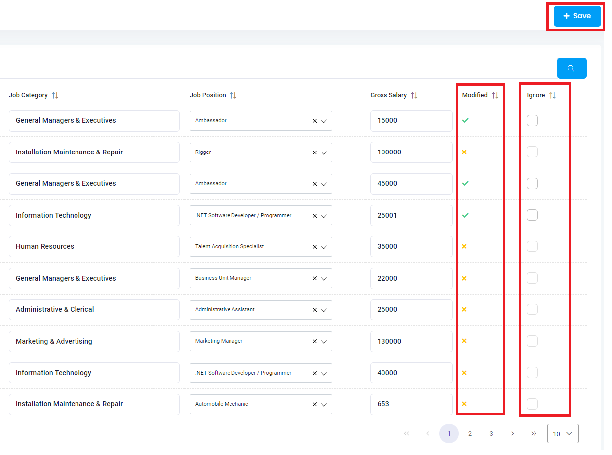 Note: Once a value is updated/changed (before Saving) the Modified indicator will show that it was changed, if the value was accidently updated for one employee, the "Ignore" flag can be activated to ignore that update out of the bulk that is updated when you save the changes.